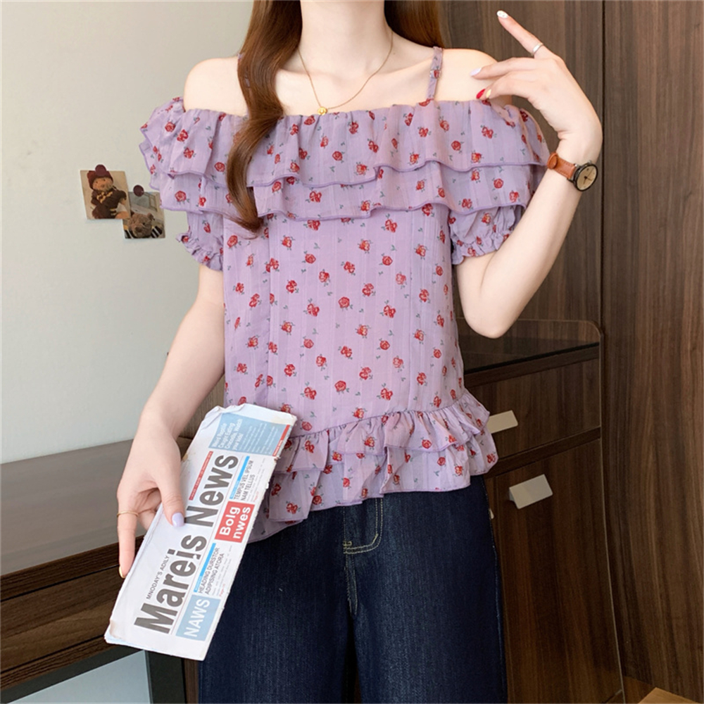 ~夏季新款一字领短袖设计感法式甜美荷叶边露肩吊带衫 服裝批發女裝批發服飾貨源