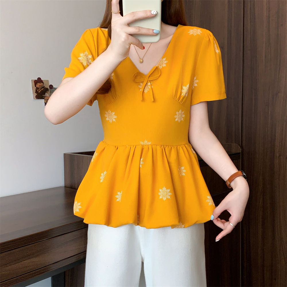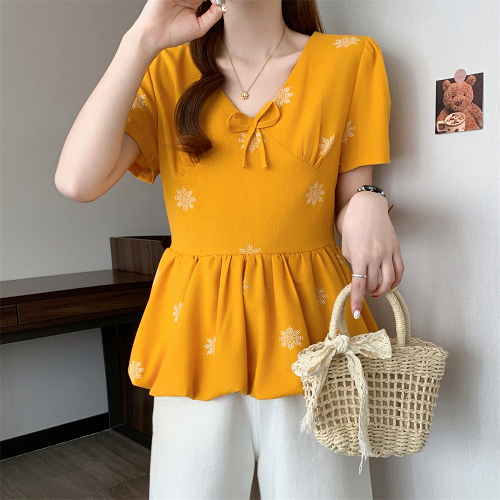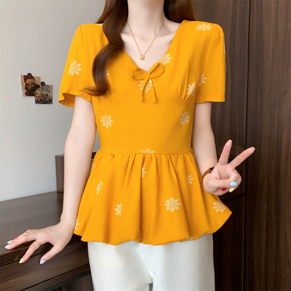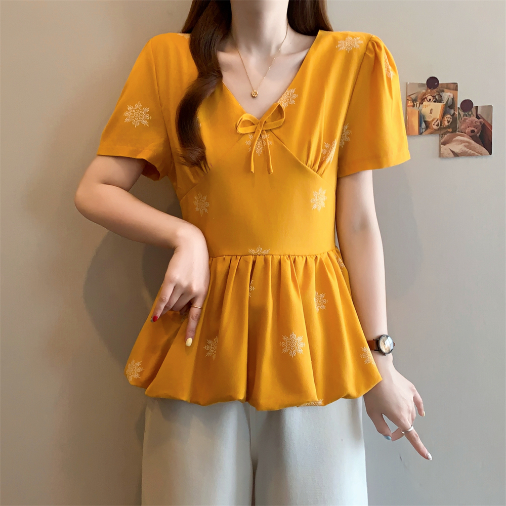 ~夏日多巴胺黄色印花v领衬衫女法式气质收腰显瘦花苞上衣 服裝批發女裝批發服飾貨源