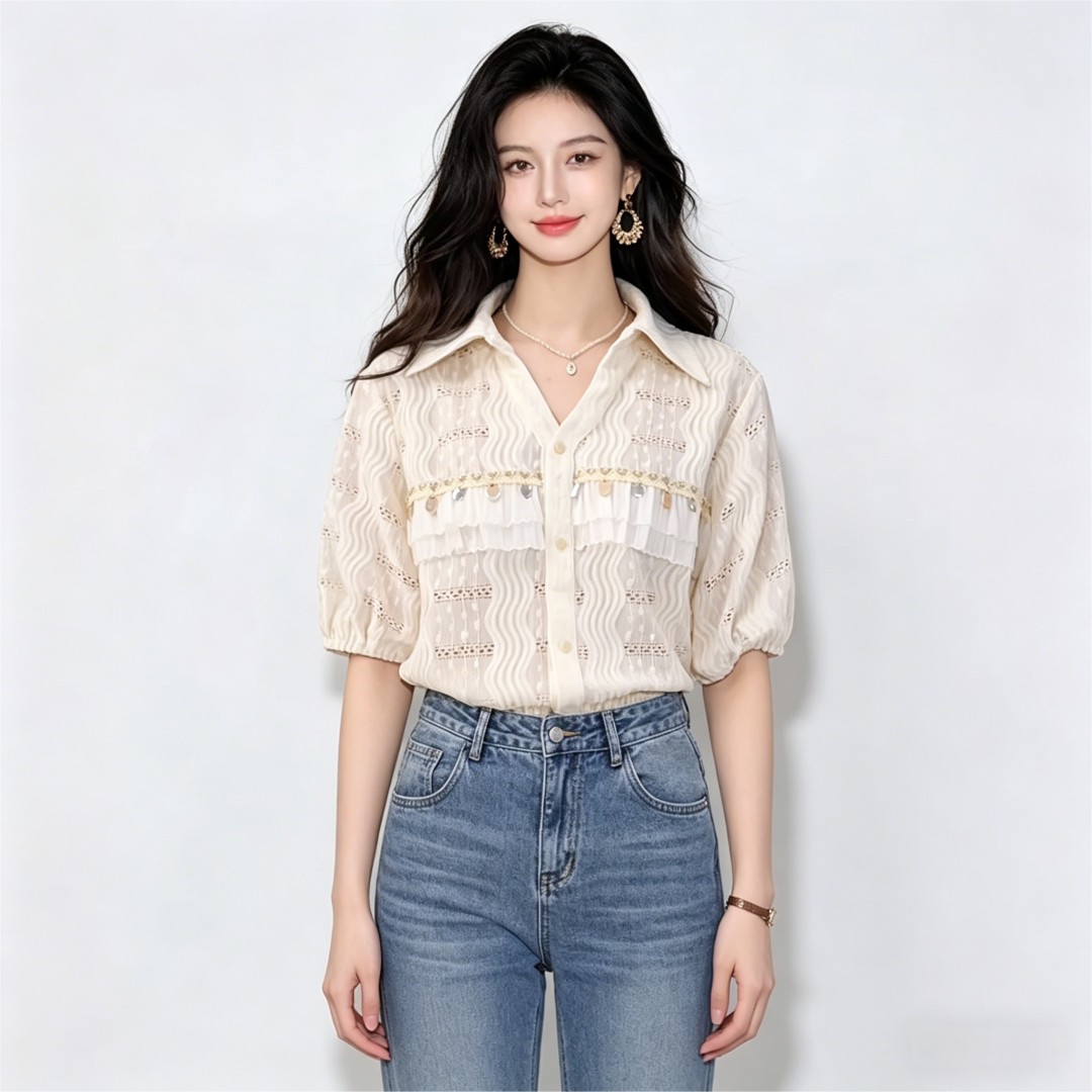 亮片镂空透气短袖衬衫女夏季气质高级感宽松上衣 服裝批發女裝批發服飾貨源
