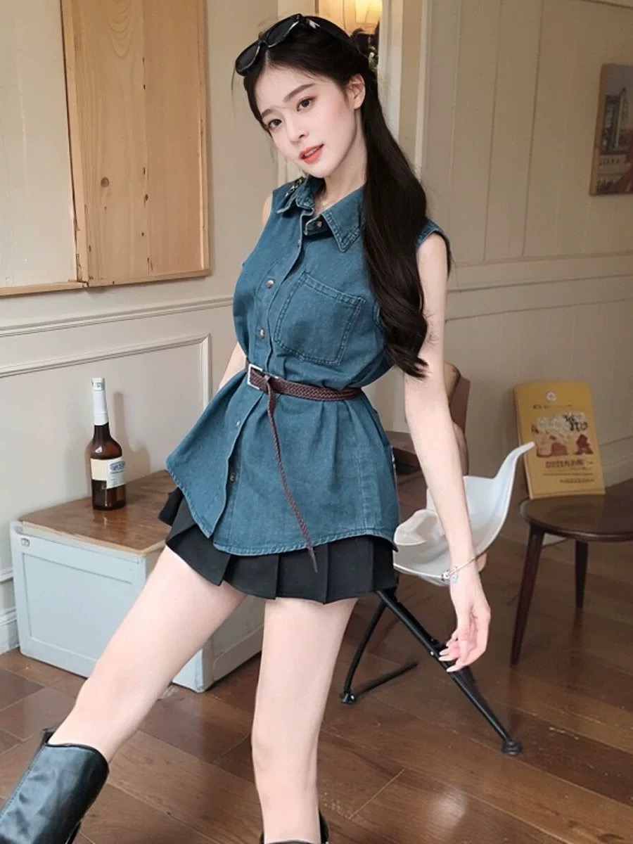 港风复古无袖牛仔衬衫女装夏季气质高级感休闲马甲上衣收腰小外套 服裝批發女裝批發服飾貨源