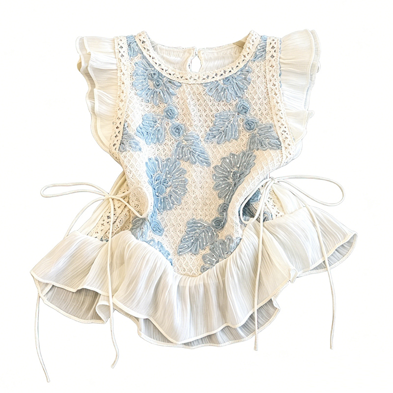 BY17594# 法式甜美假两件拼接无袖背心衬衫女夏季短款荷叶边小飞袖绑带上衣 服裝批發女裝批發服飾貨源