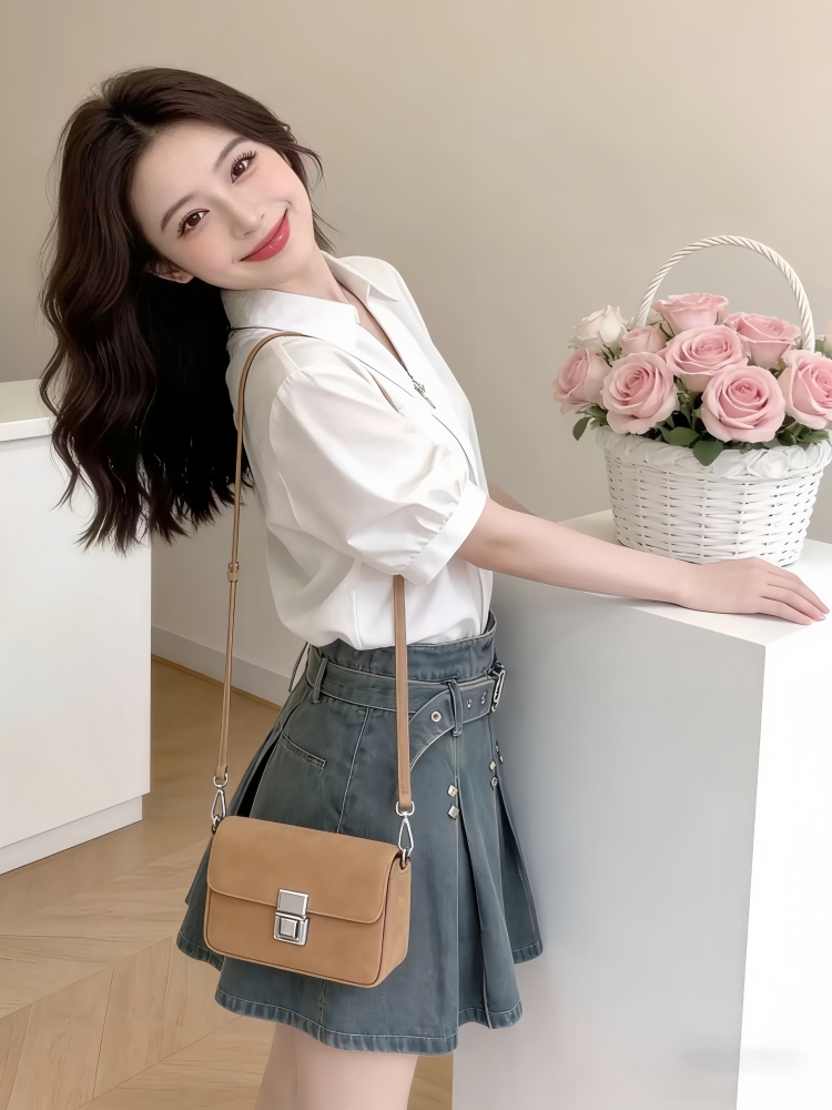夏日穿搭套装女新款气质减龄V领泡泡袖白色衬衫牛仔百褶裙两件套 服裝批發女裝批發服飾貨源