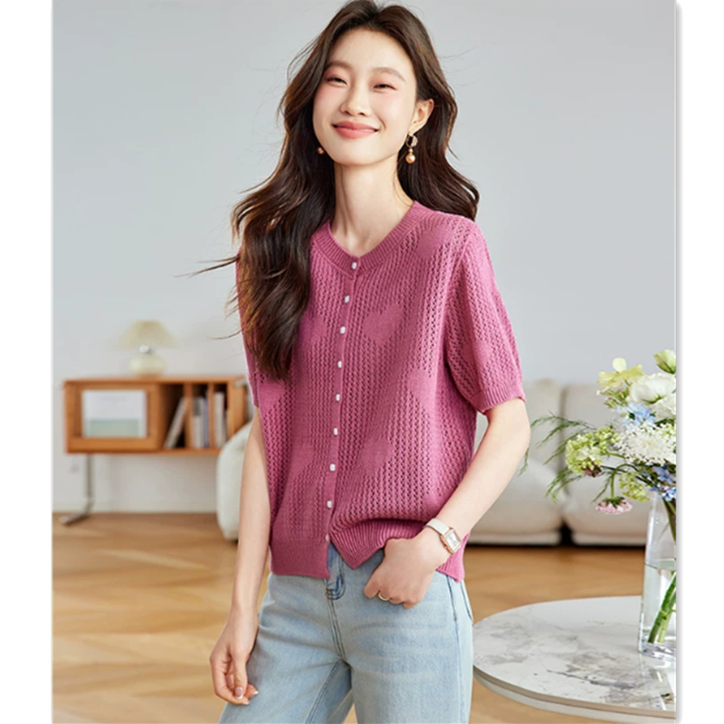 夏季新款镂空薄款设计感冰丝针织短袖T恤女上衣洋气时尚小衫 服裝批發女裝批發服飾貨源
