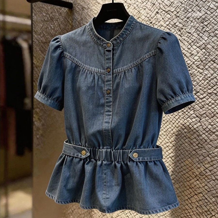 超好看时尚牛仔风收腰衬衫女夏季高级感百搭修身气质短袖上衣 服裝批發女裝批發服飾貨源