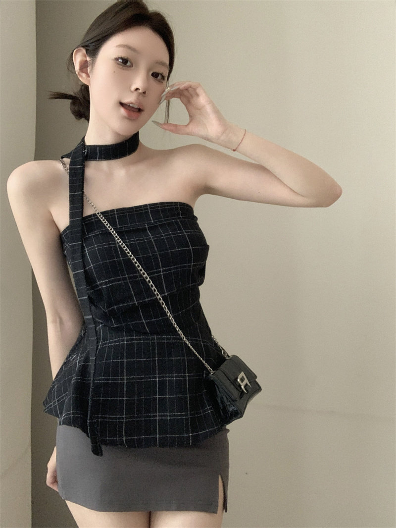 韩系挂脖蓝色格纹吊带背心夏季女褶皱收腰设计感上衣配飘带 服裝批發女裝批發服飾貨源