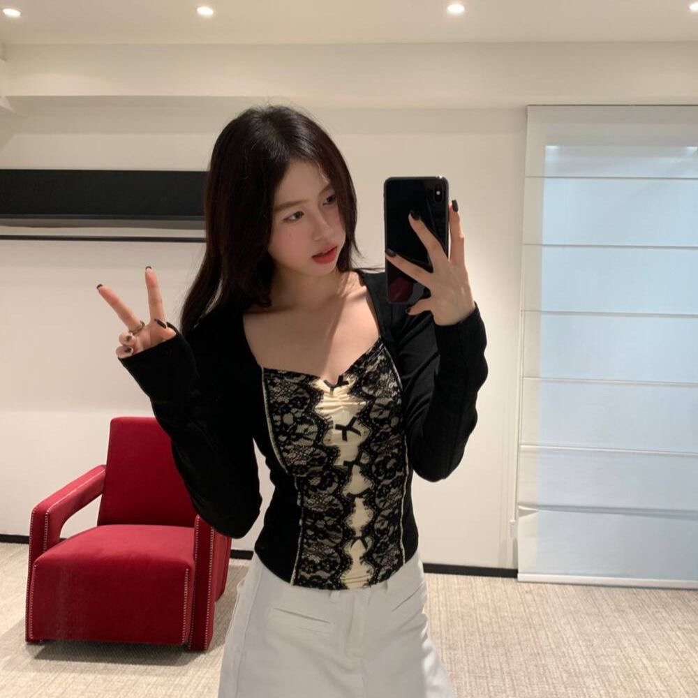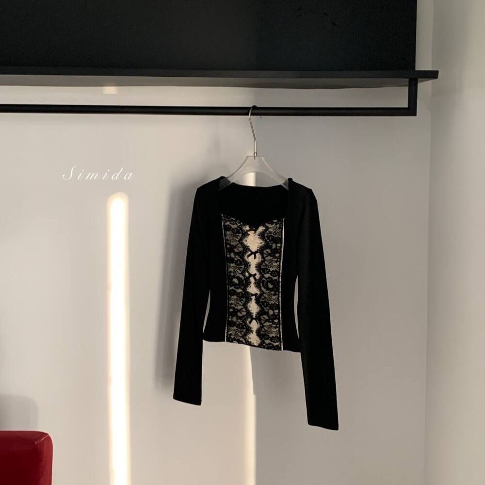 FA51205# 方领蕾丝拼接蝴蝶结气质修身长袖上衣遮肉韩版遮肚ins纯欲风辣妹 服裝批發女裝批發服飾貨源