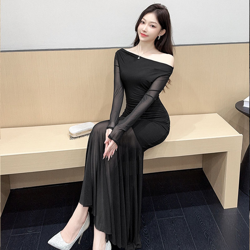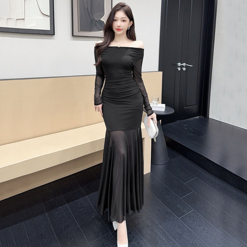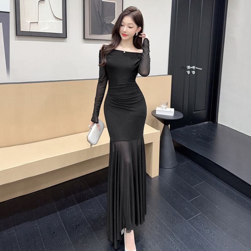FA51256# 设计感露肩长袖小黑裙女收腰显瘦网纱拼接鱼尾裙约会派对长裙 服裝批發女裝批發服飾貨源
