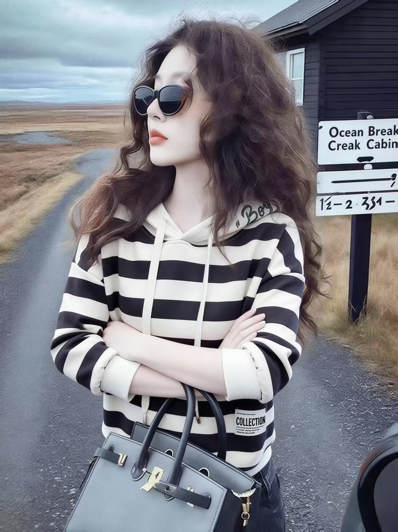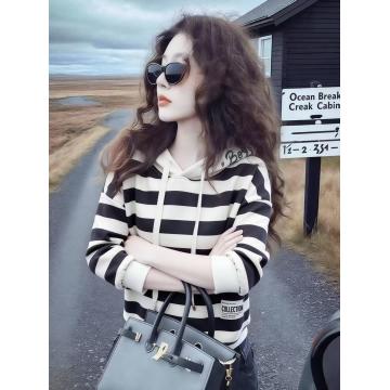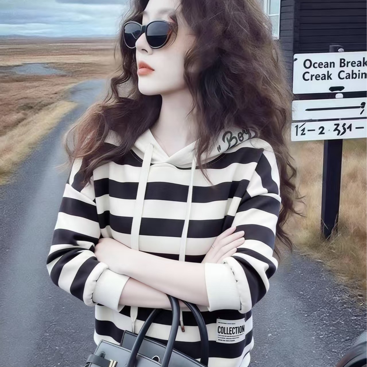 FA51327# 秋季新款韩版时尚宽松条纹刺绣连帽卫衣气质百搭加厚上衣 服裝批發女裝批發服飾貨源