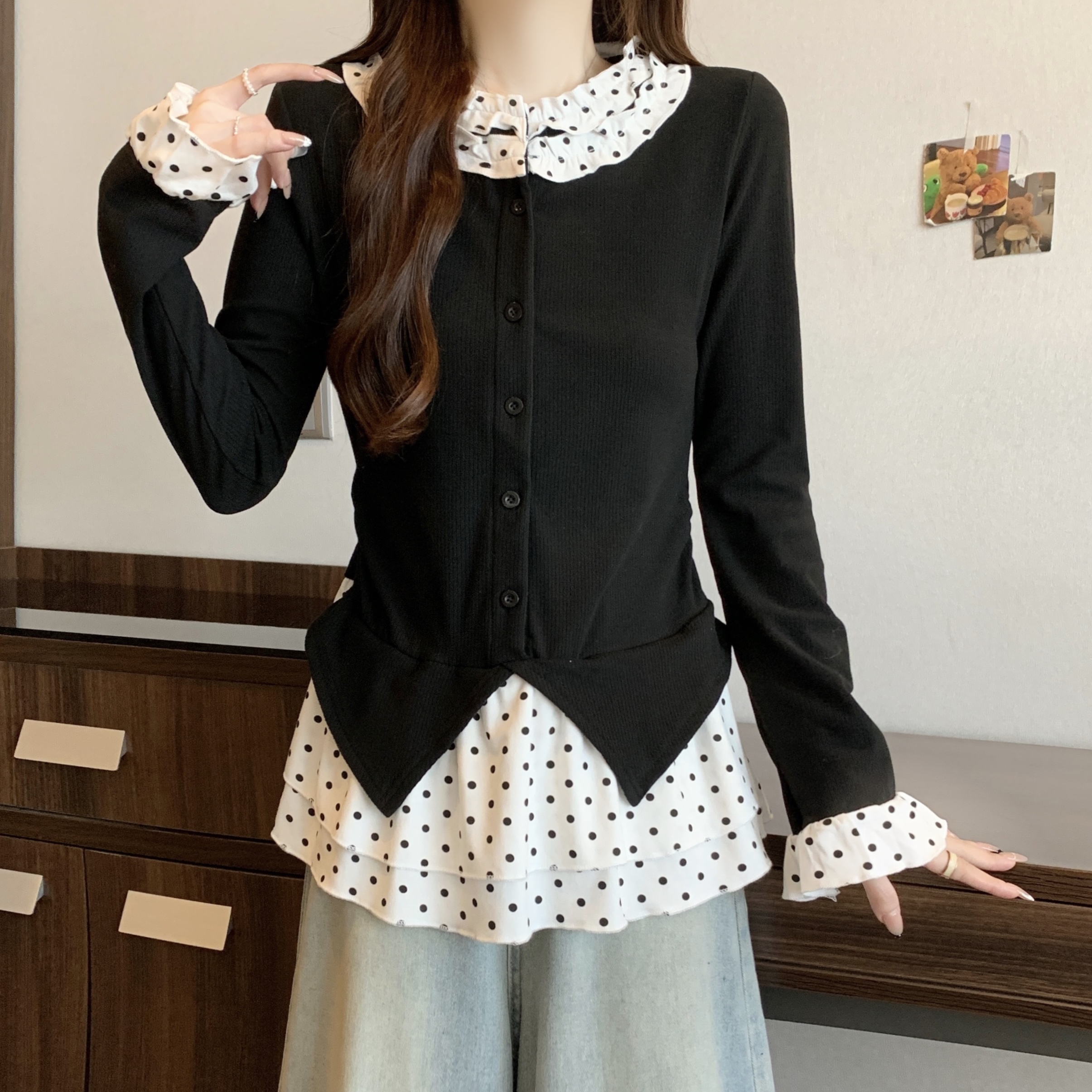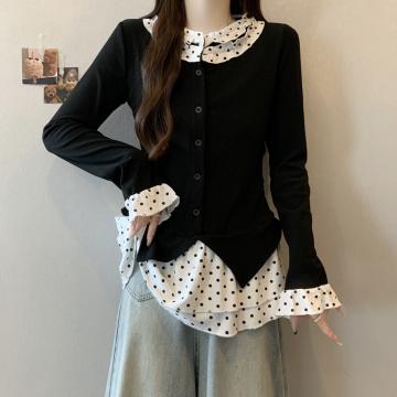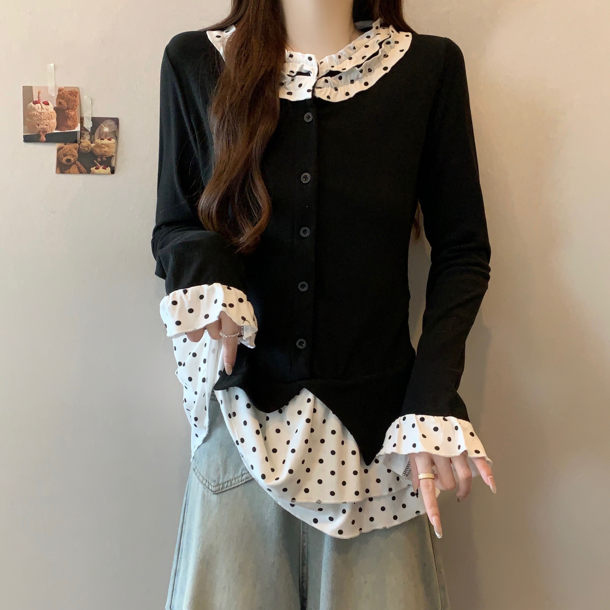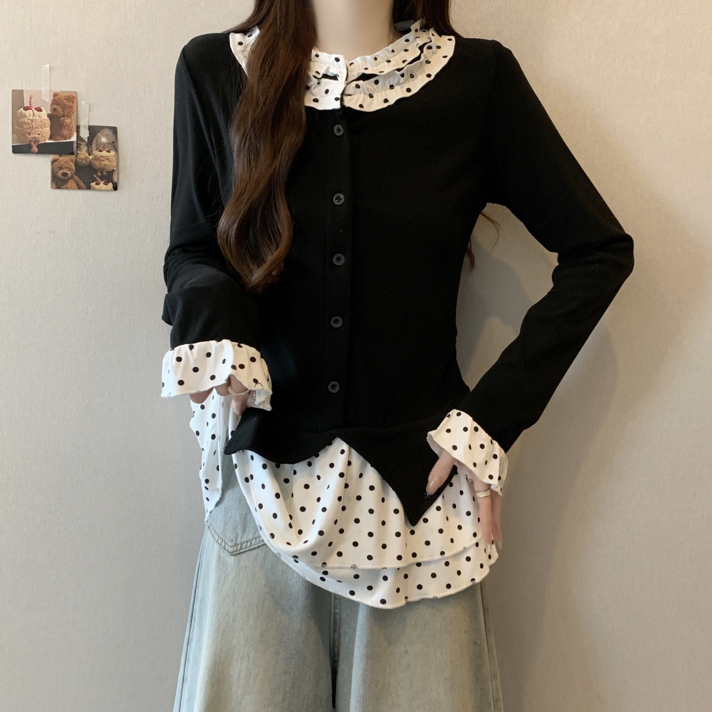 Home > 长袖雪纺衫、衬衫、上衣 > FA51625# 大码微胖mm韩系小香风女加绒设计感波点辣妹针织上衣假两件 服裝批發女裝批發服飾貨源