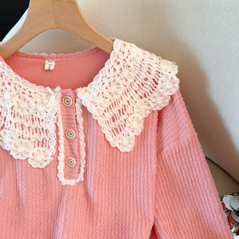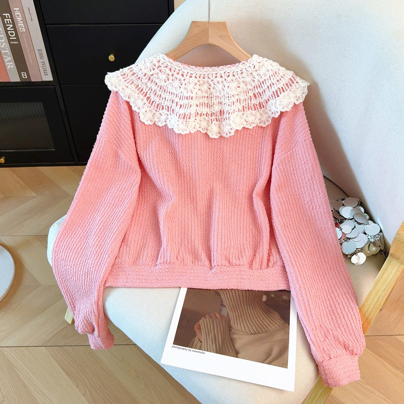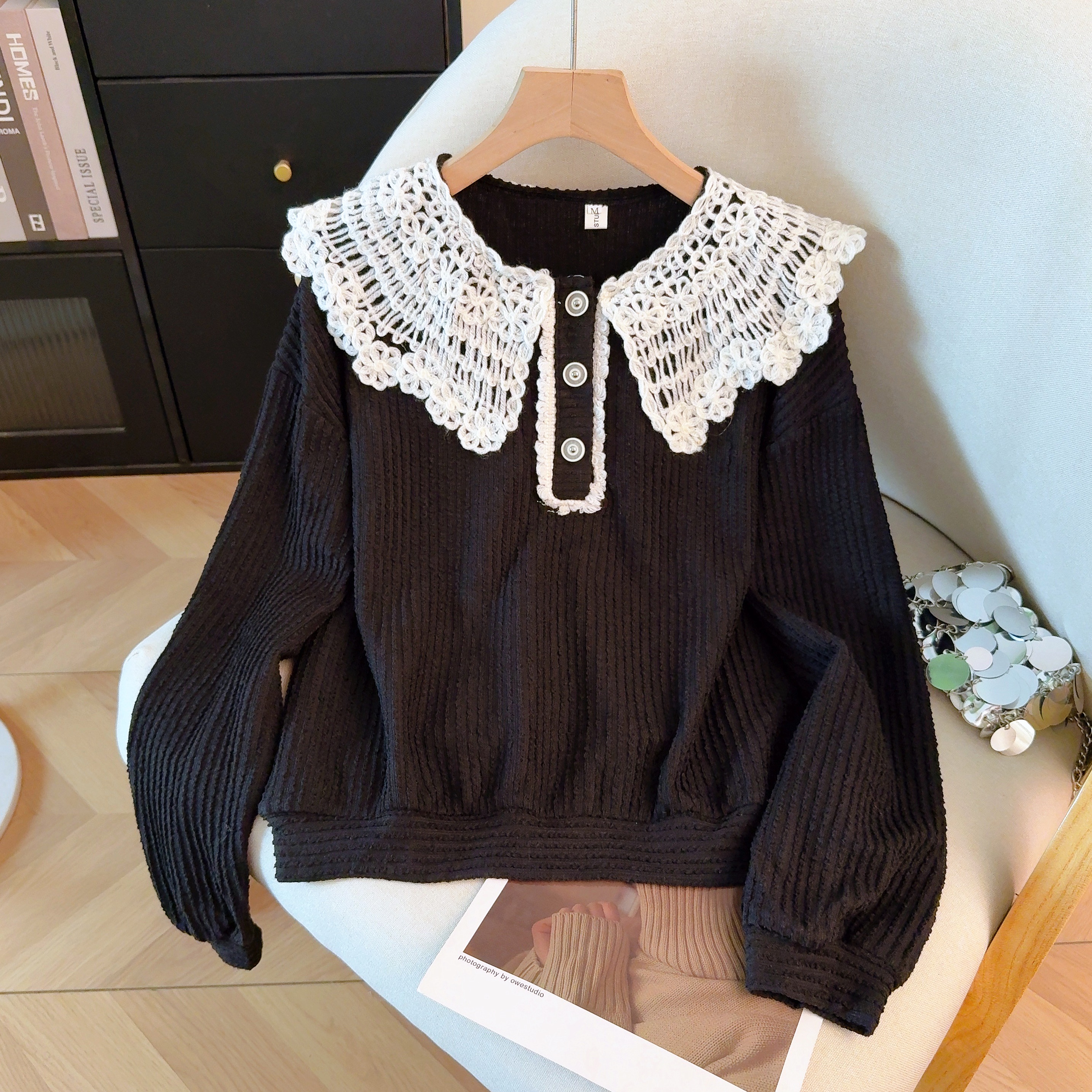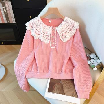 FA51637# 学院风蕾丝拼接娃娃领卫衣女春秋新款洋气宽松设计感上衣 服裝批發女裝批發服飾貨源