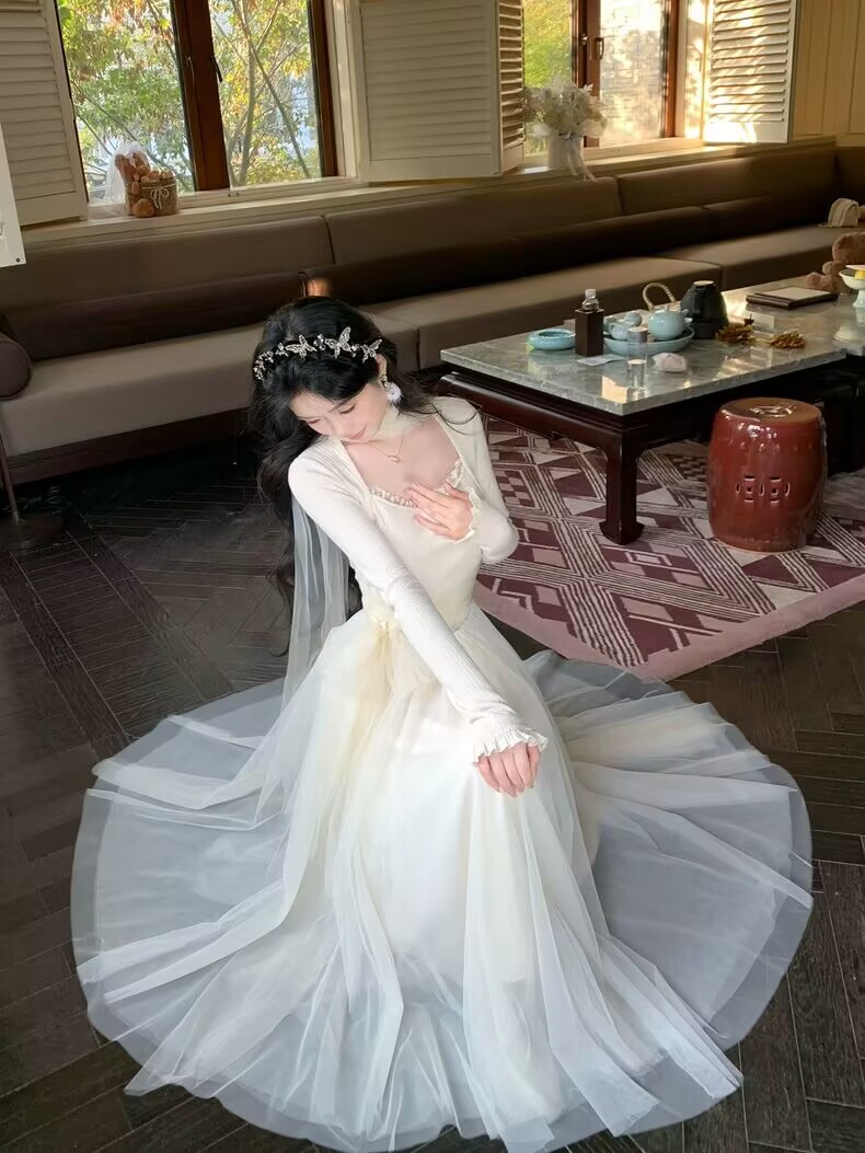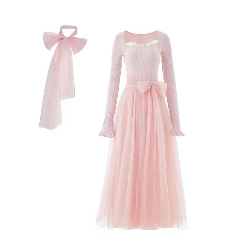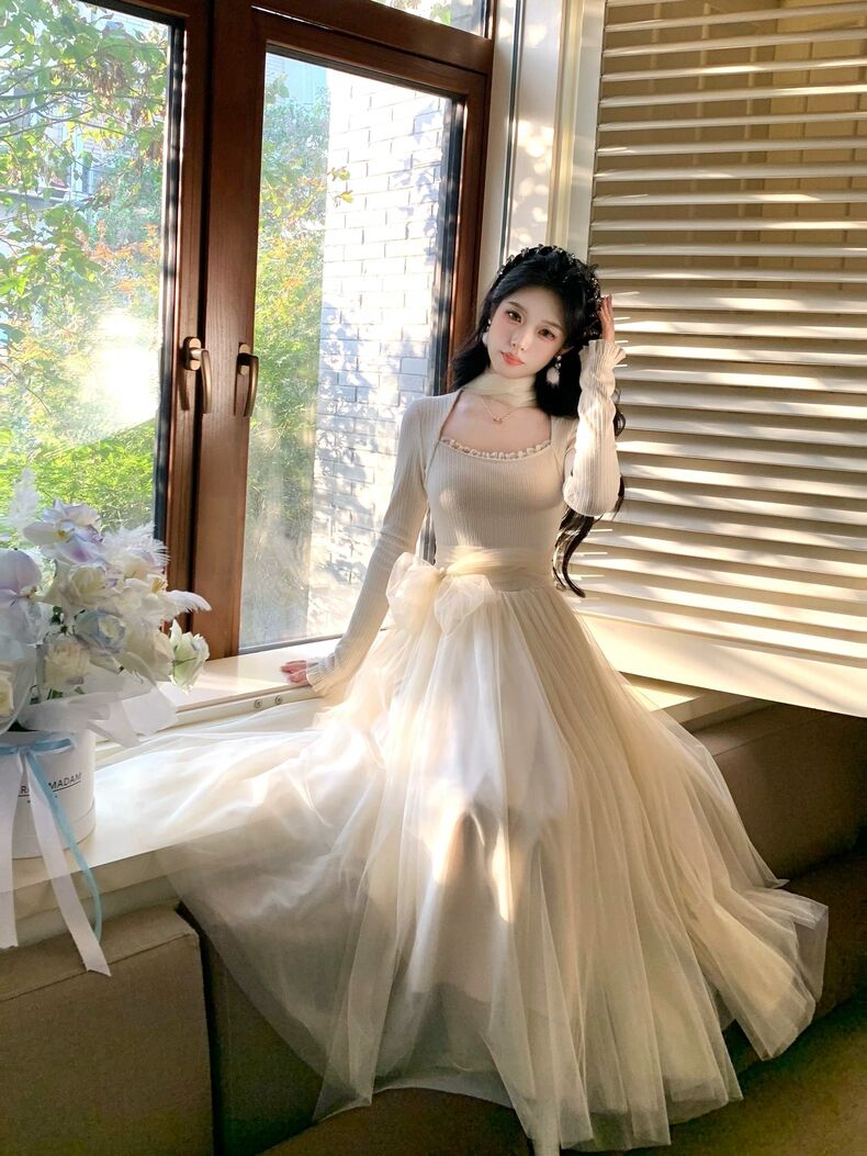 FA51197# 少女感温柔拼接网纱仙女风显瘦长袖连衣裙加厚 服裝批發女裝批發服飾貨源