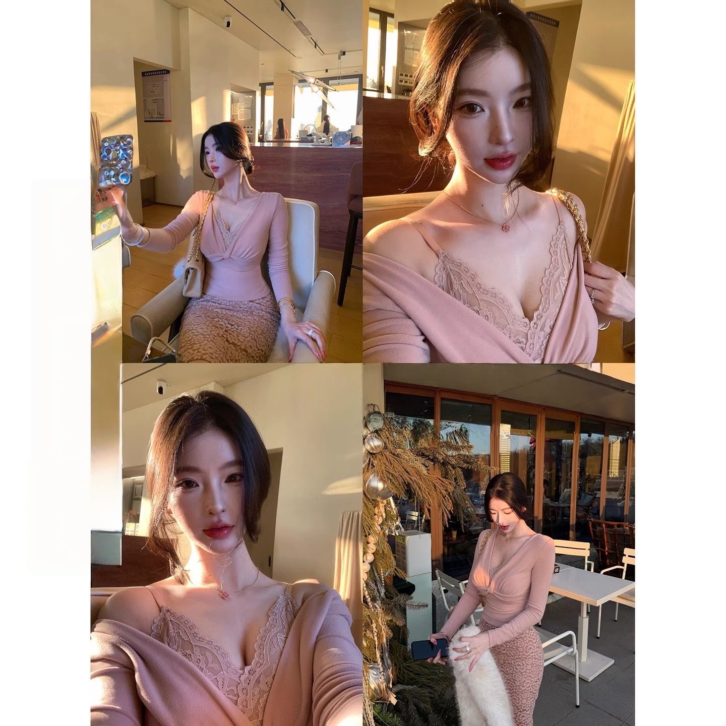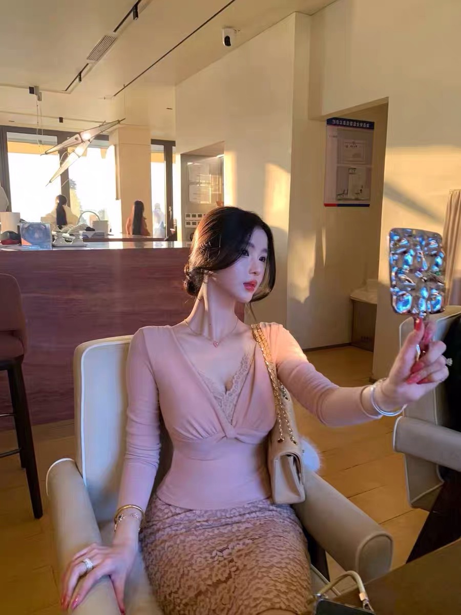 FA51209# 纯欲风御姐法式新款高级设计感蕾丝拼接v领收腰长袖t恤圣诞 服裝批發女裝批發服飾貨源