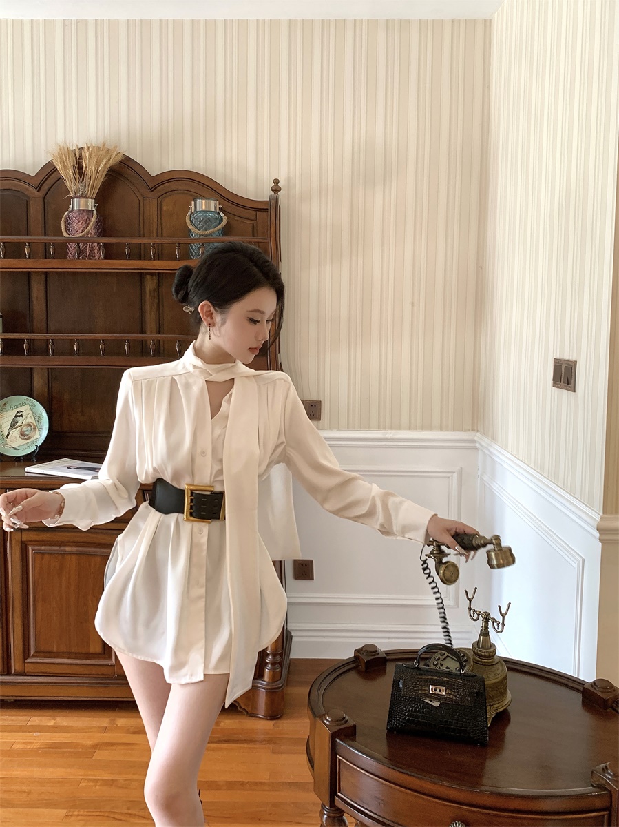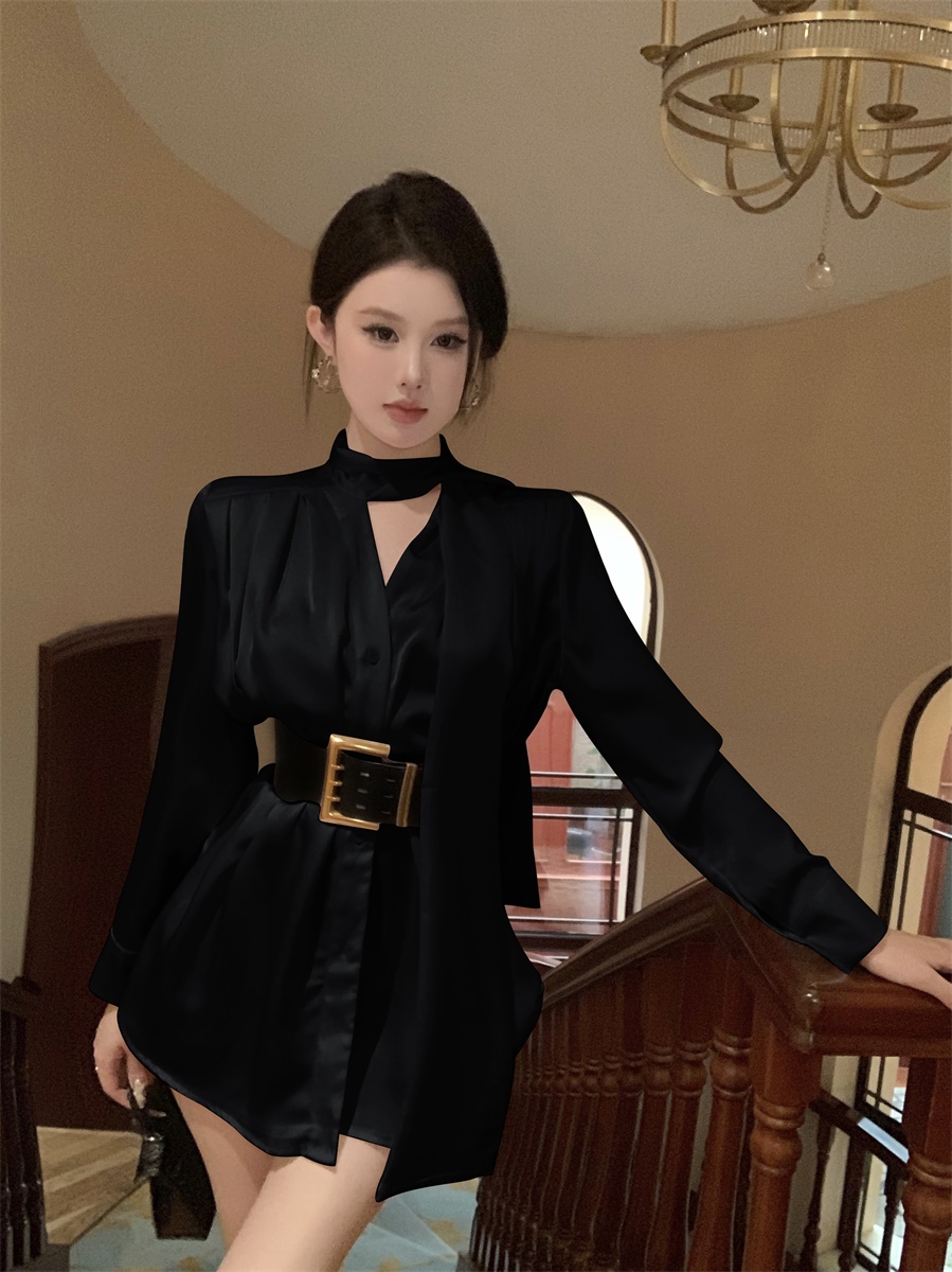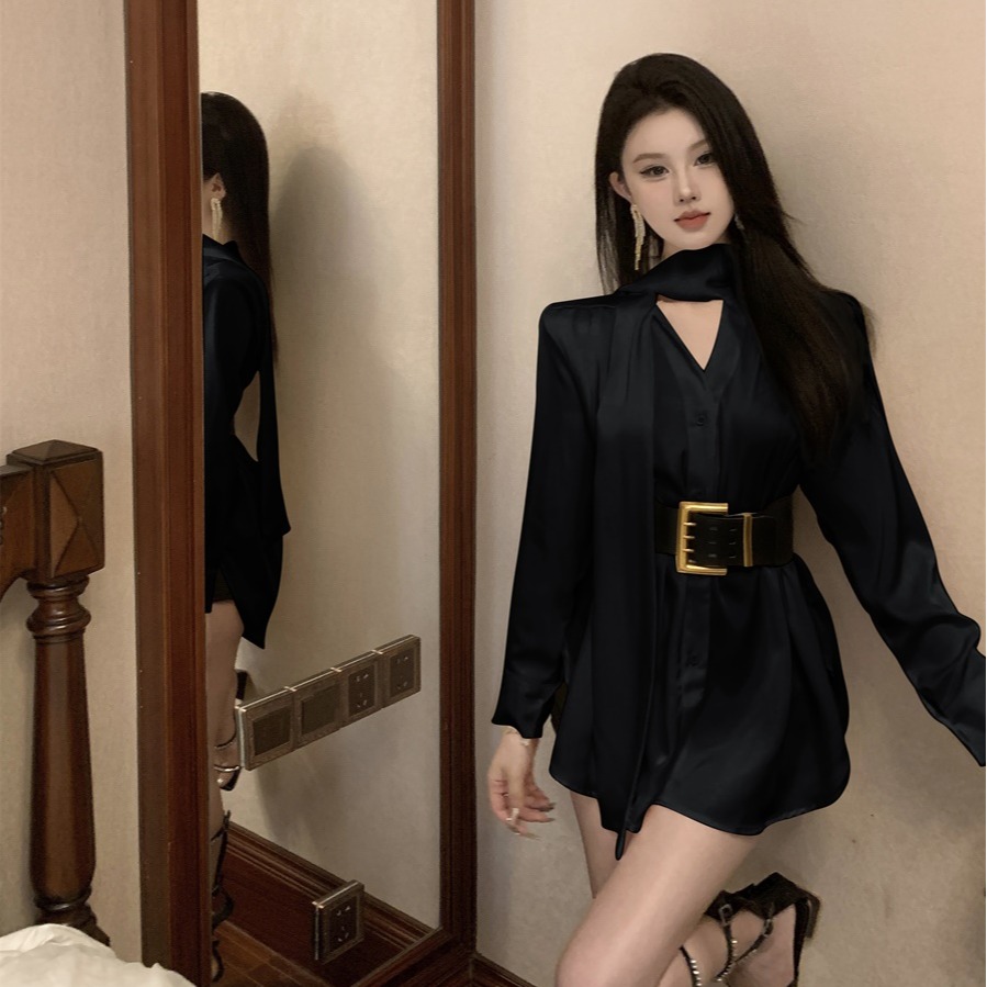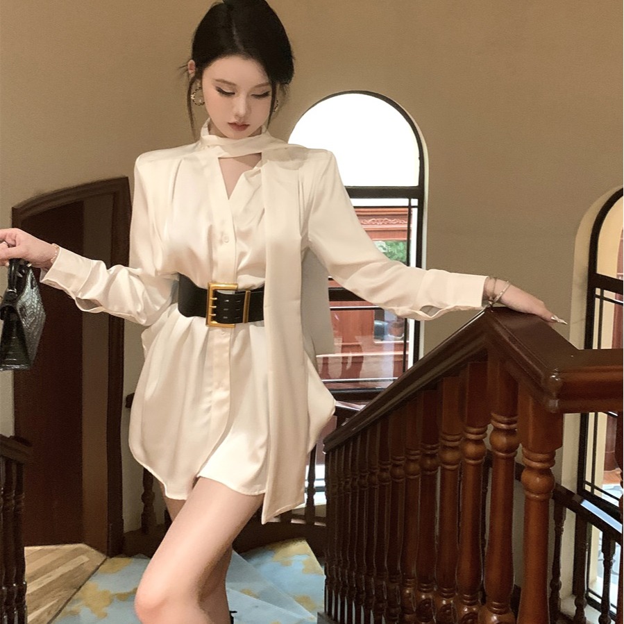 FA51243# 法式气质名媛高级感缎面衬衫连衣裙夏季不规则气质短裙女装 服裝批發女裝批發服飾貨源