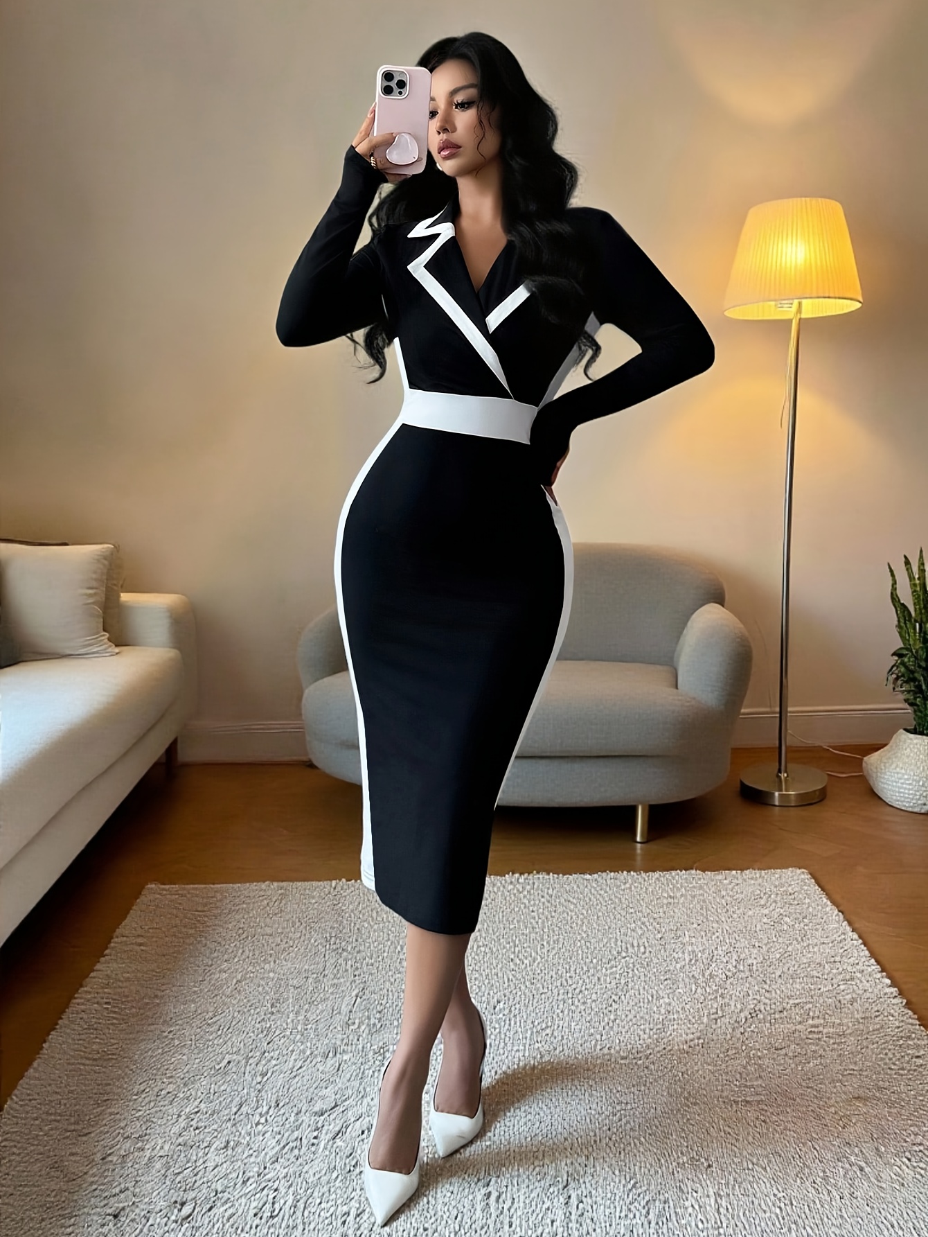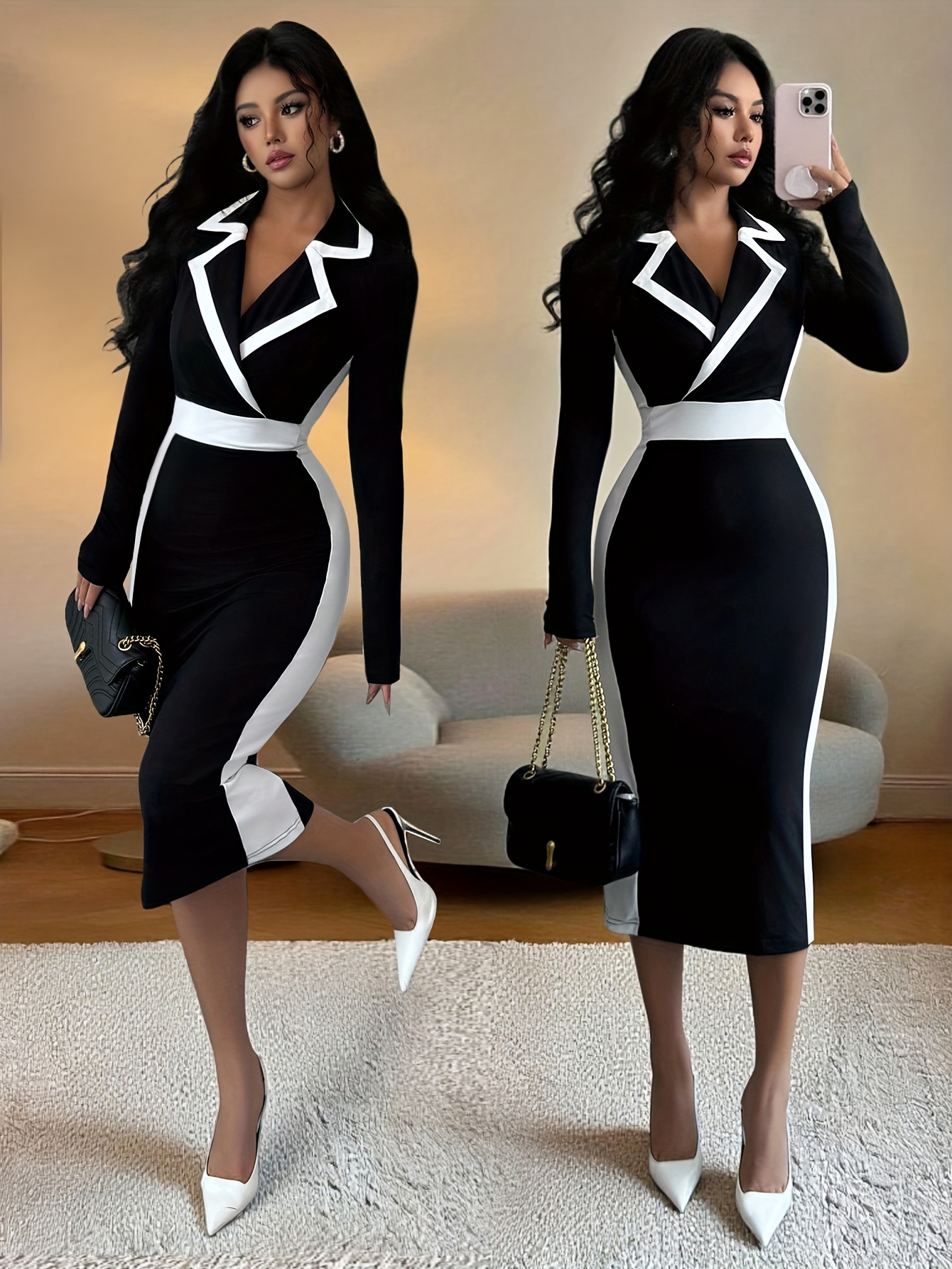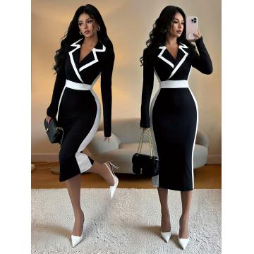 FA51262# 女士秋季新款优雅撞色西装领修身长袖中长款连衣裙 服裝批發女裝批發服飾貨源
