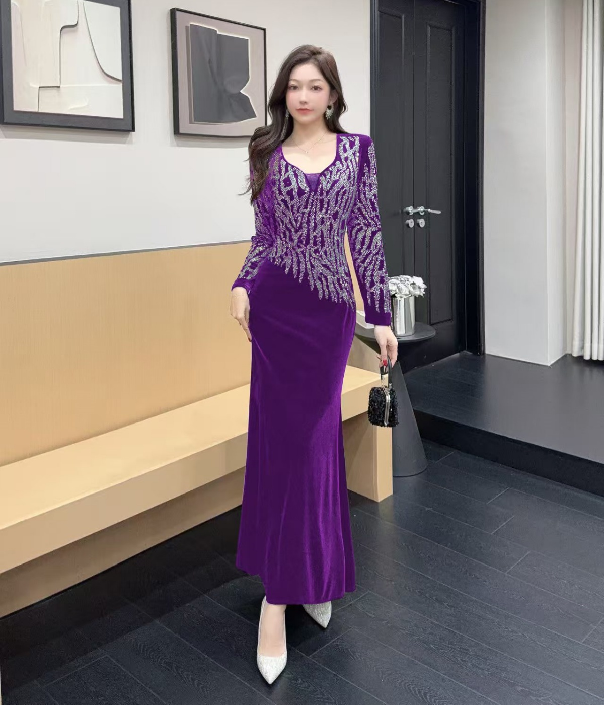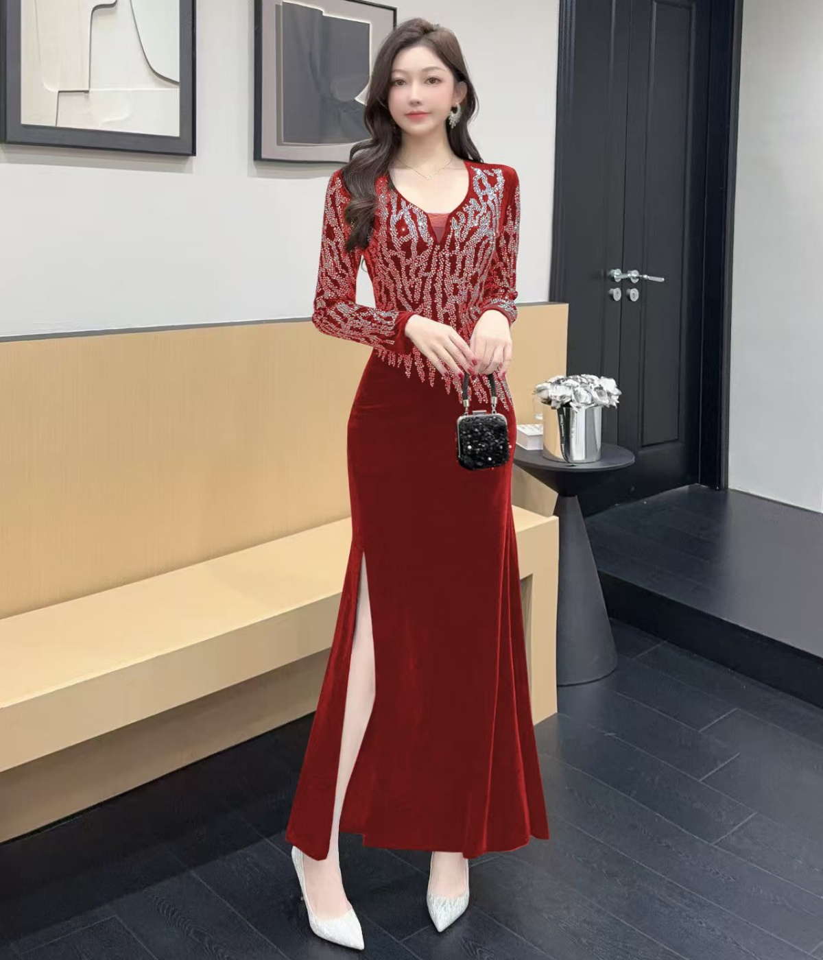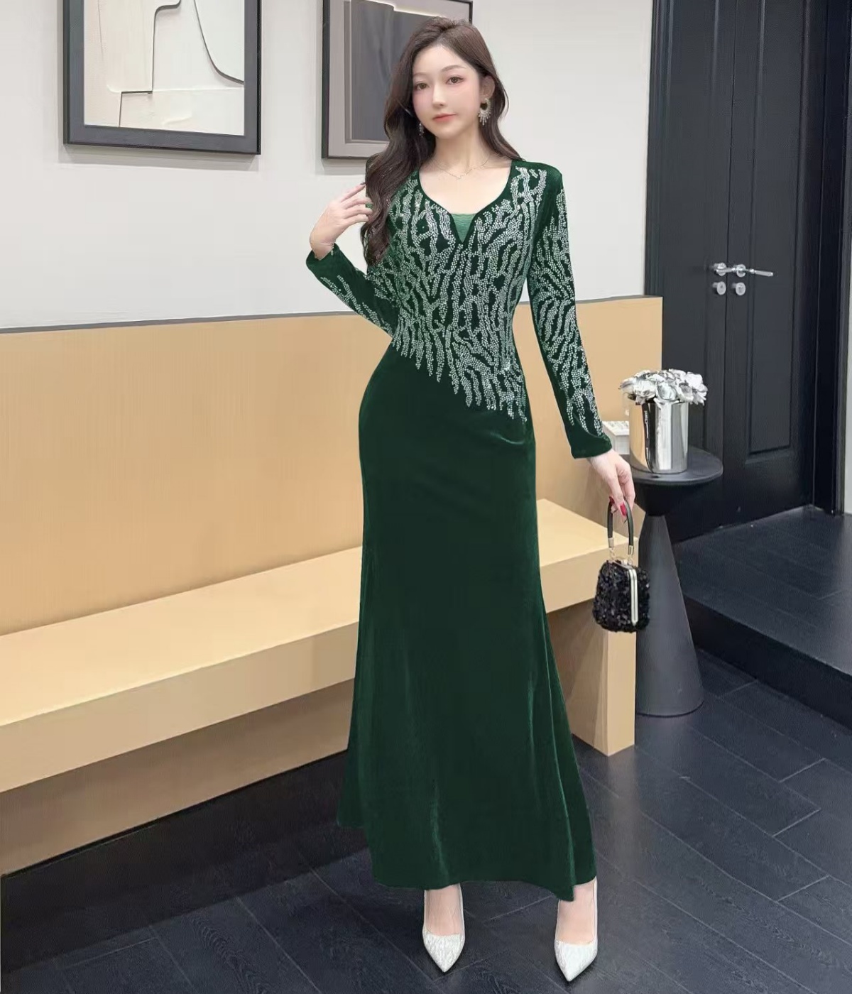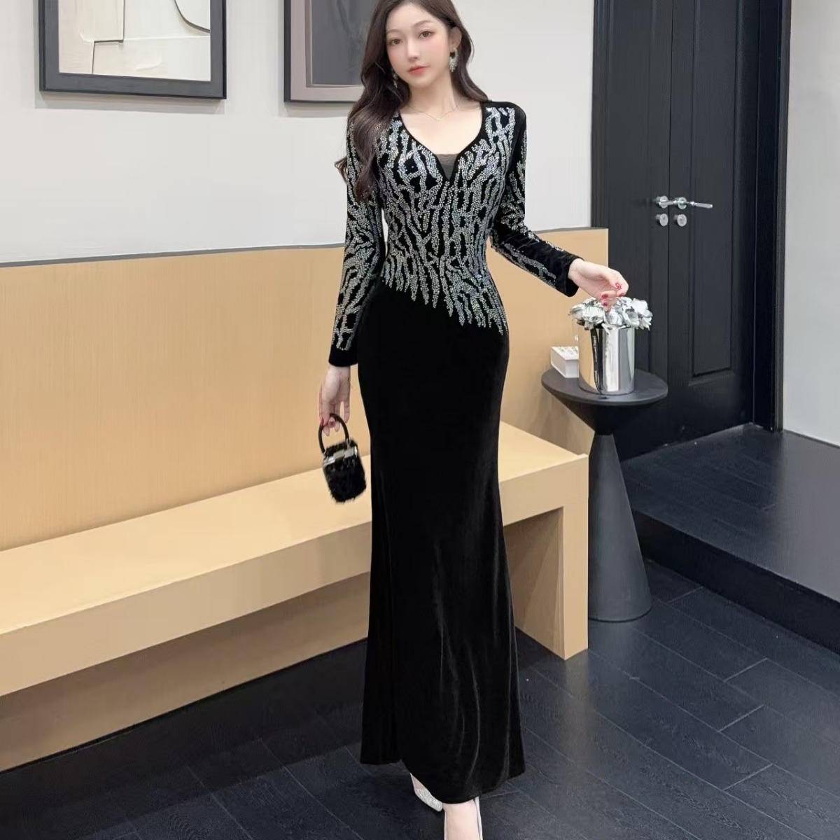 FA51296# 时尚网红v领烫钻长裙包臀连衣裙 服裝批發女裝批發服飾貨源