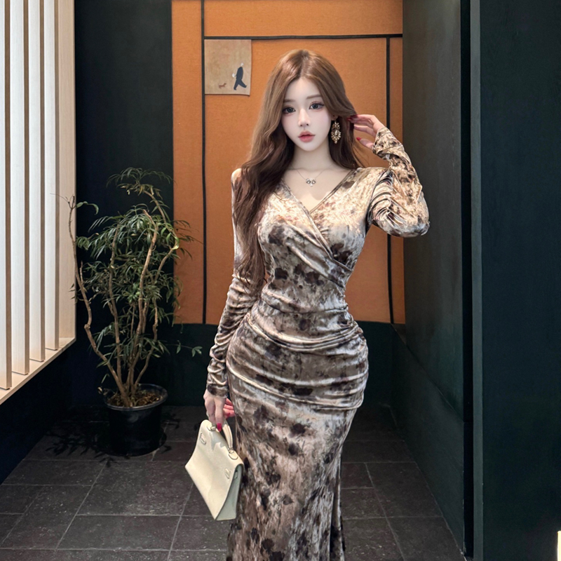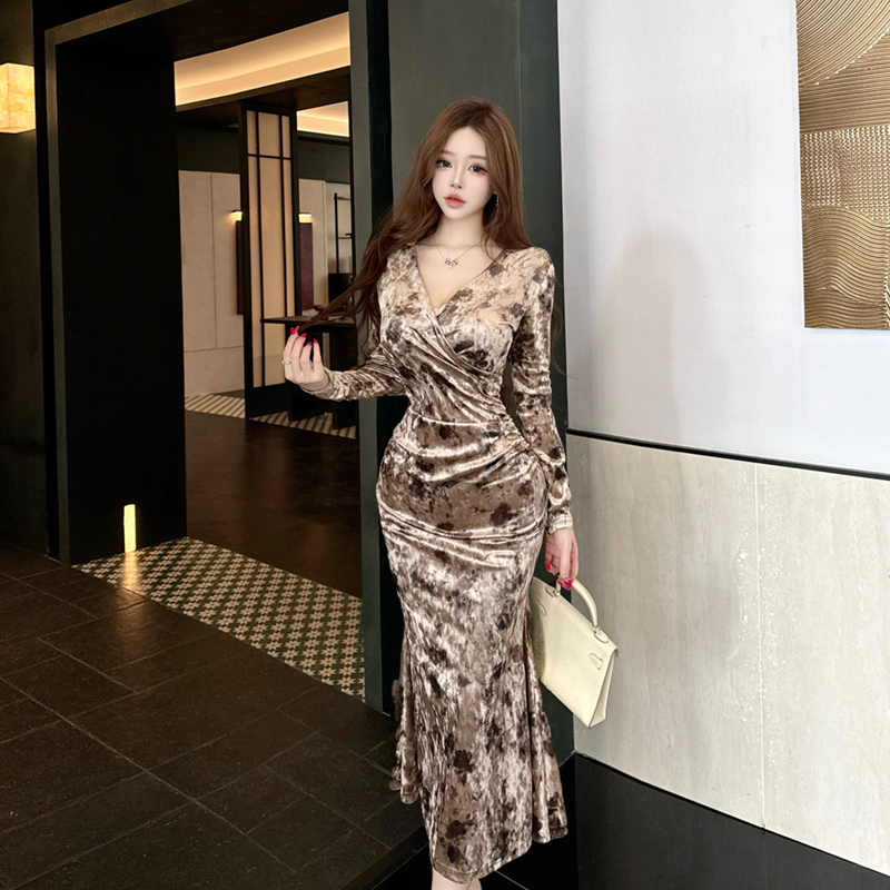 FA51309# 丝绒连衣裙秋冬新款气质轻奢V领长袖修身显瘦包臀鱼尾长裙 服裝批發女裝批發服飾貨源