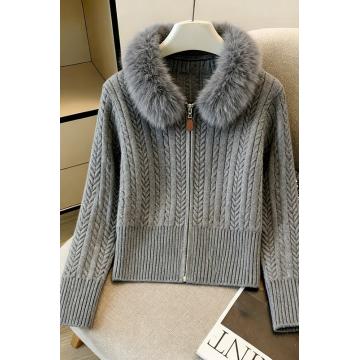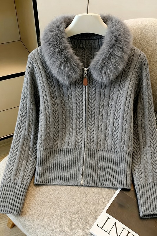 FA51456# 大毛领连帽针织衫上衣女秋冬慵懒风百搭长袖修身麻花开衫外套 服裝批發女裝批發服飾貨源