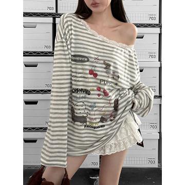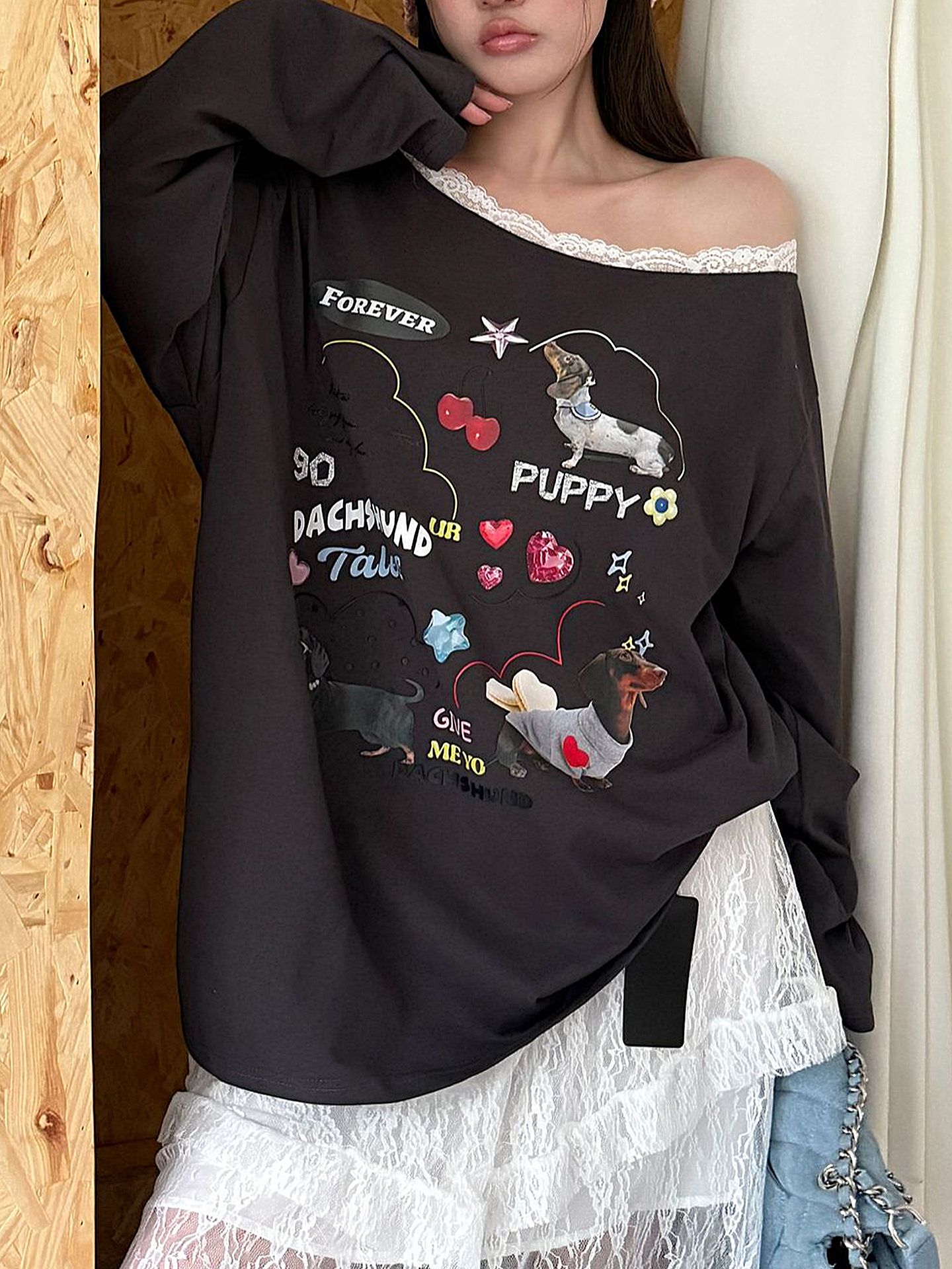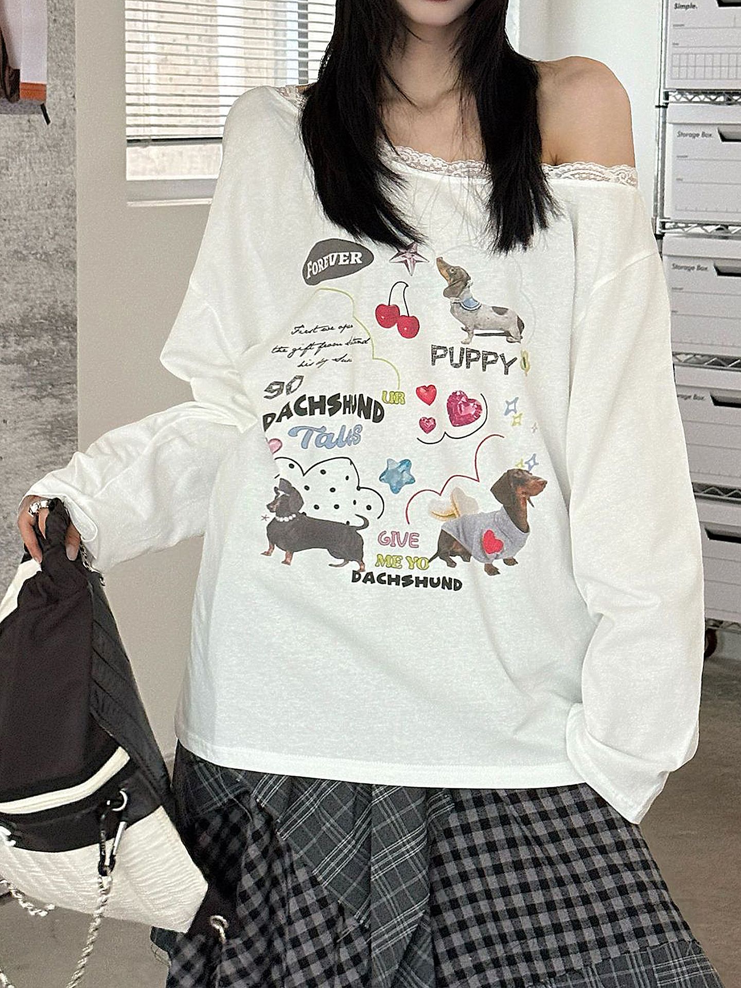 FA51612# 美式秋新品蕾丝花边卡通印花腊肠狗斜肩长袖T恤女上衣 服裝批發女裝批發服飾貨源