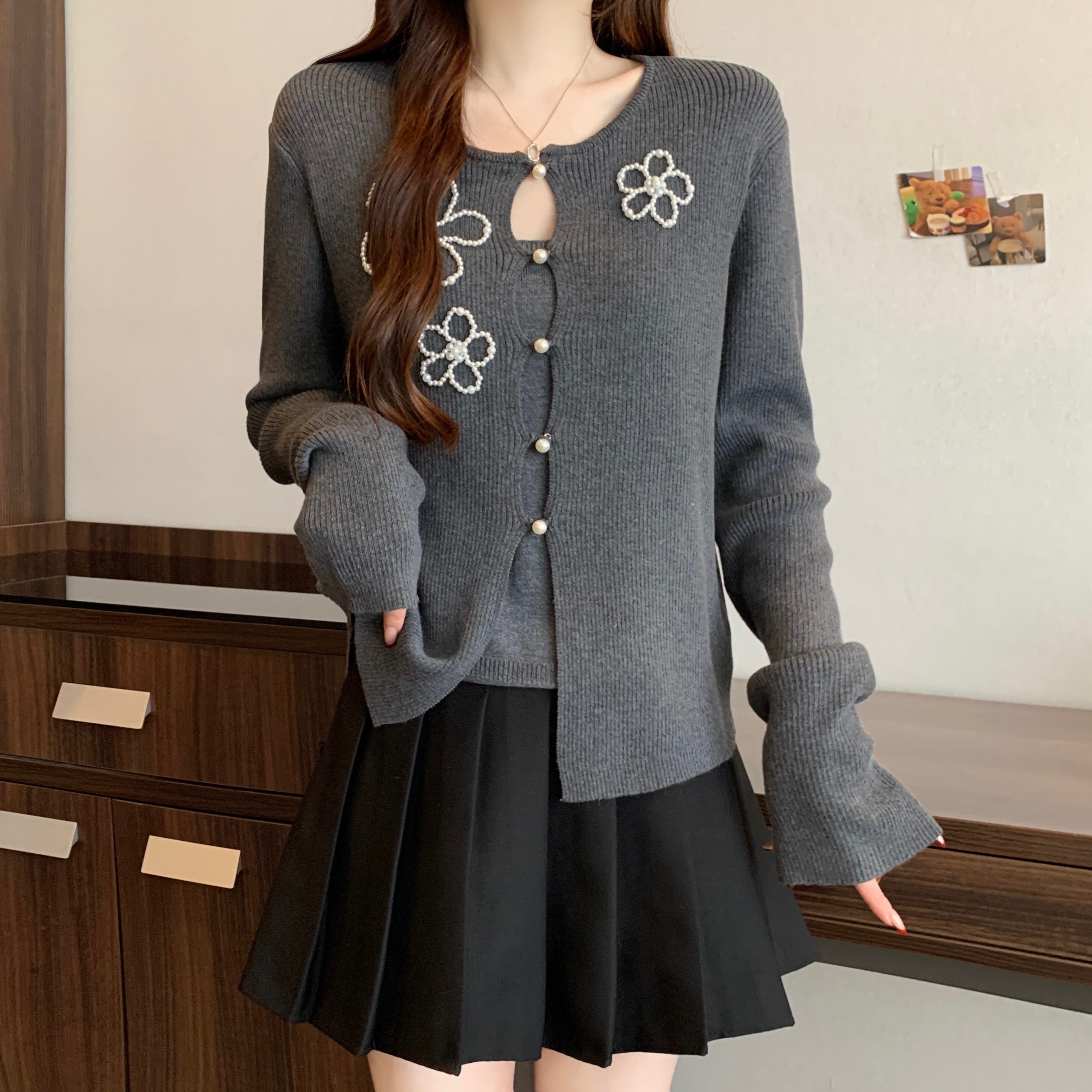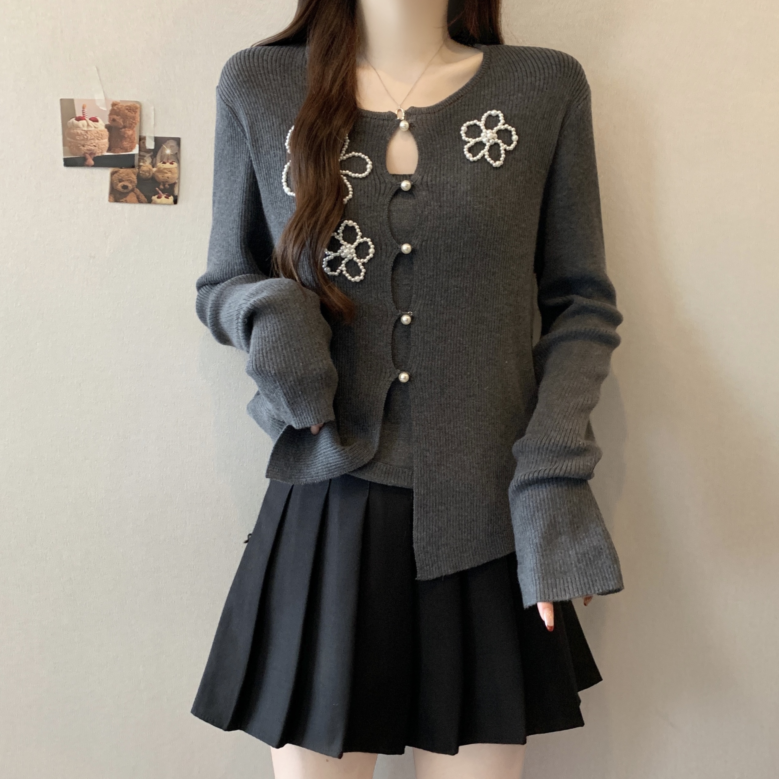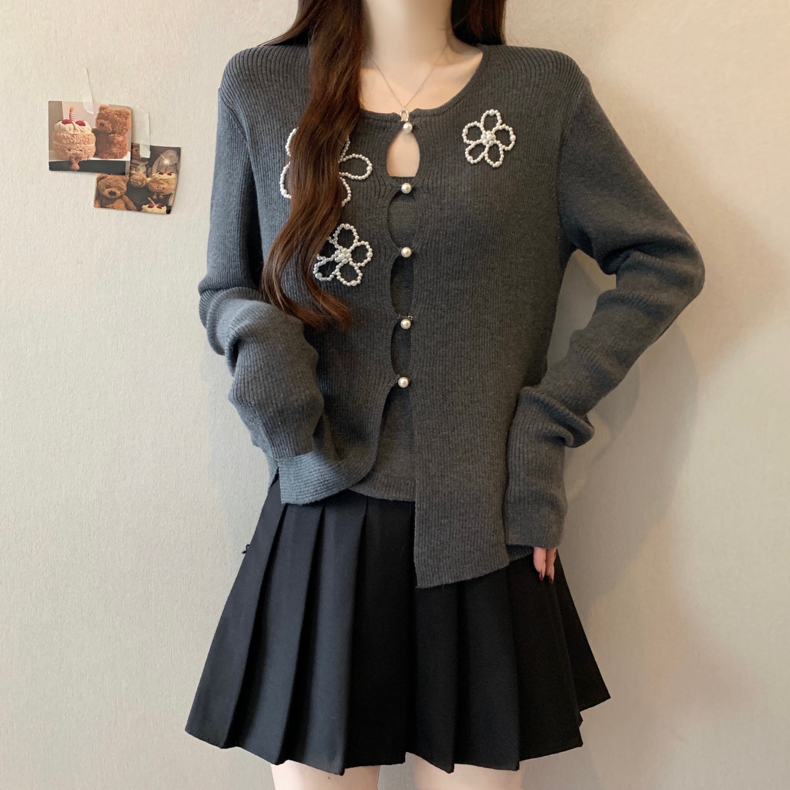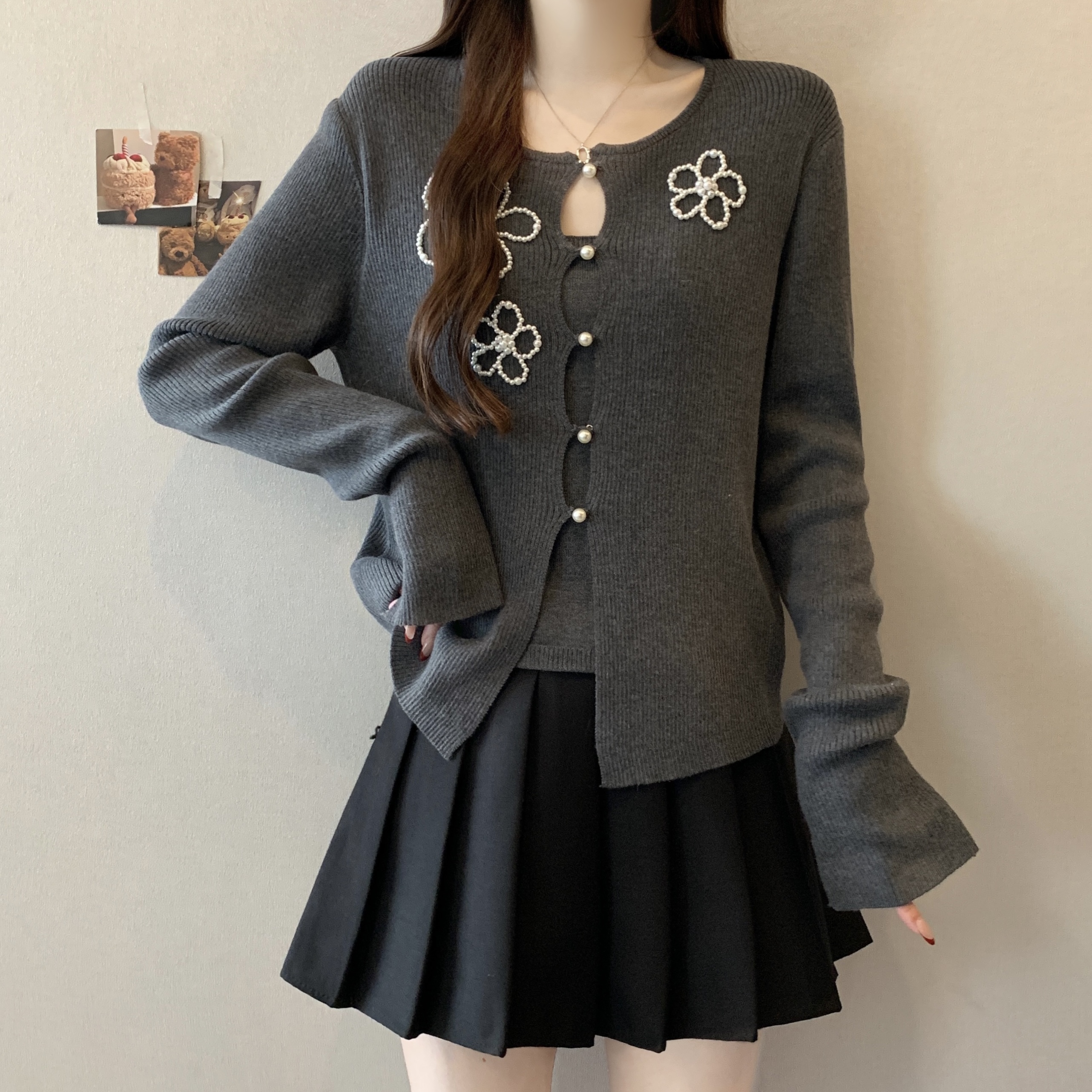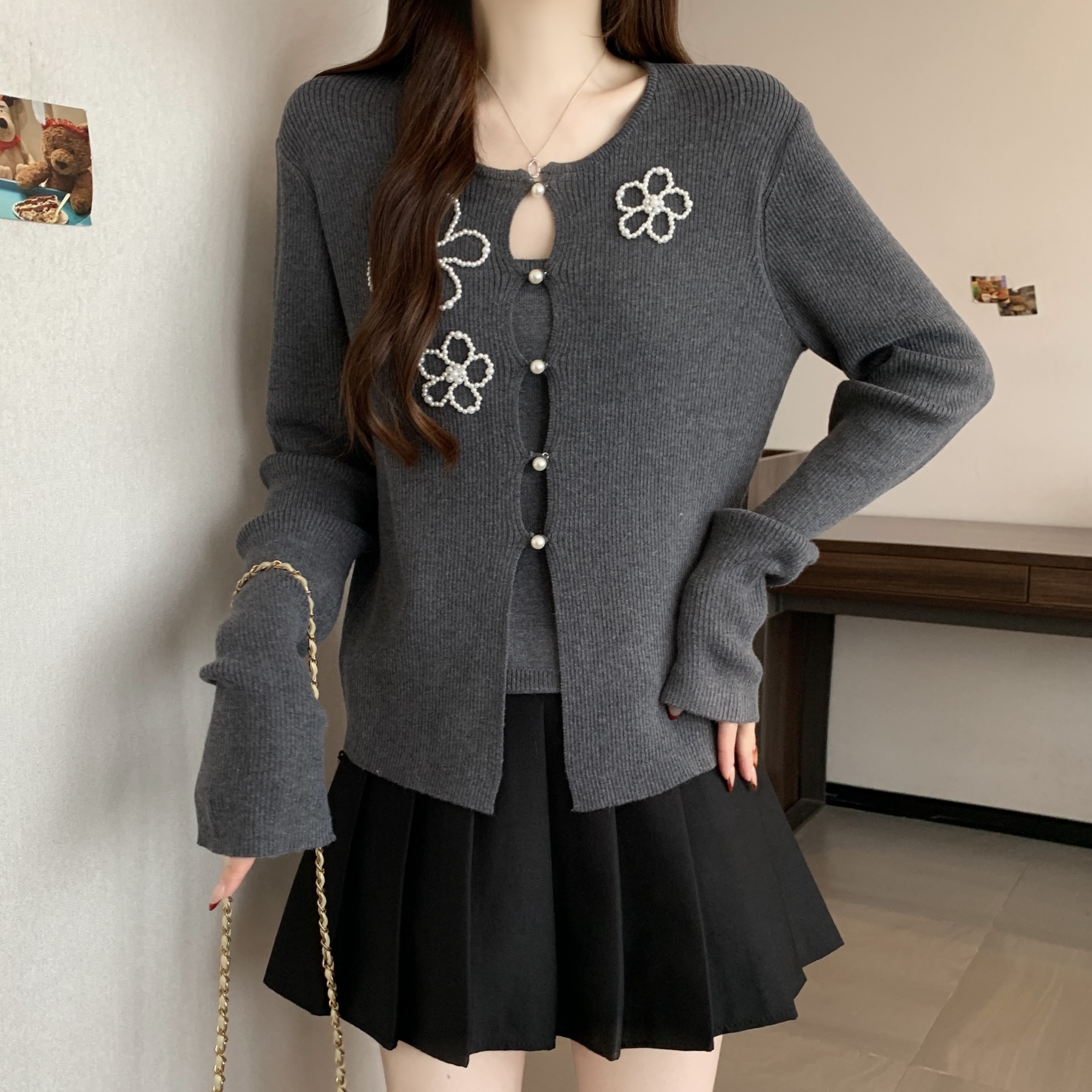 FA51623# 大码假两件花朵钉珠针织衫上衣秋冬新款内搭灰色打底衫 服裝批發女裝批發服飾貨源