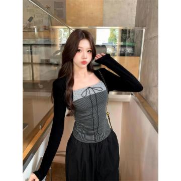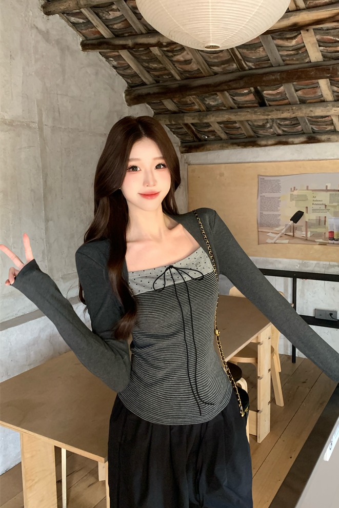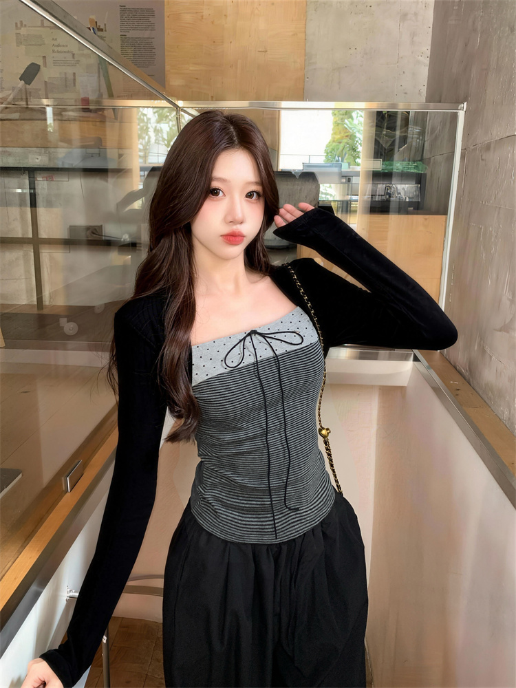 FA51633# 辣妹韩系撞色蝴蝶结系带波点元素坎肩假两件上衣T恤女 服裝批發女裝批發服飾貨源