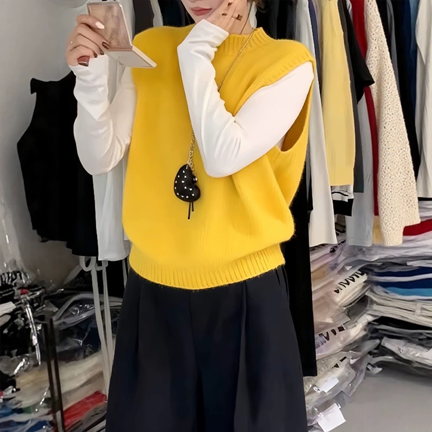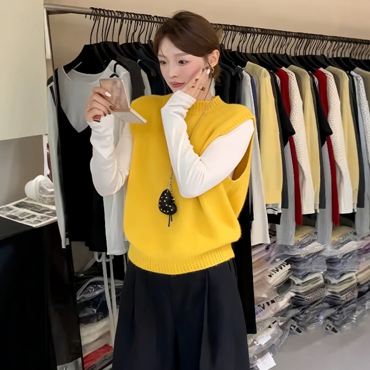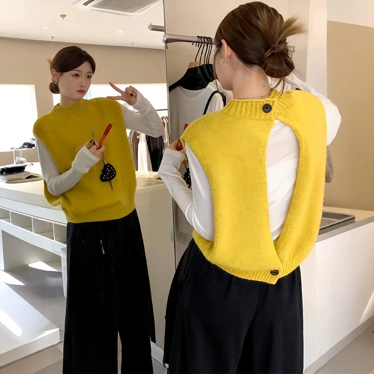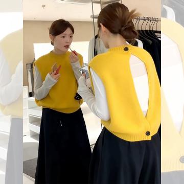 FA51648# 黄色后背镂空叠穿坎肩针织马甲背心女秋冬季巨好看的外穿上衣 服裝批發女裝批發服飾貨源