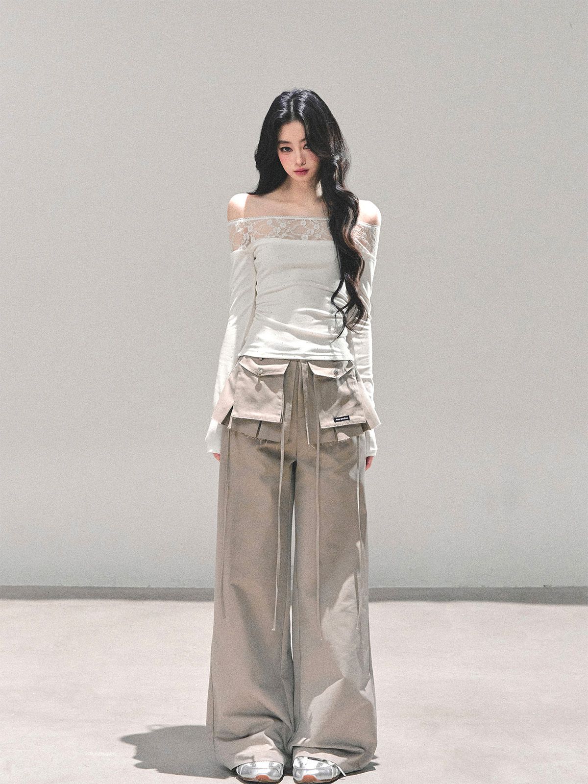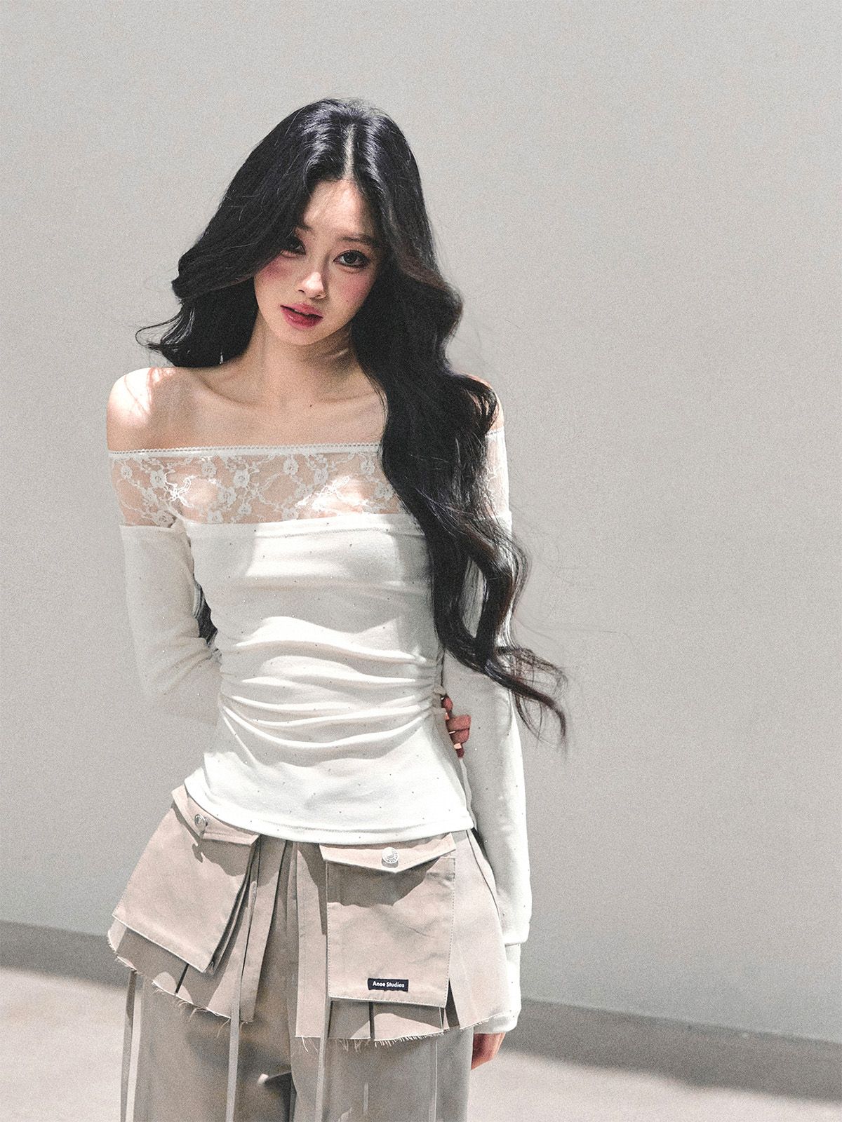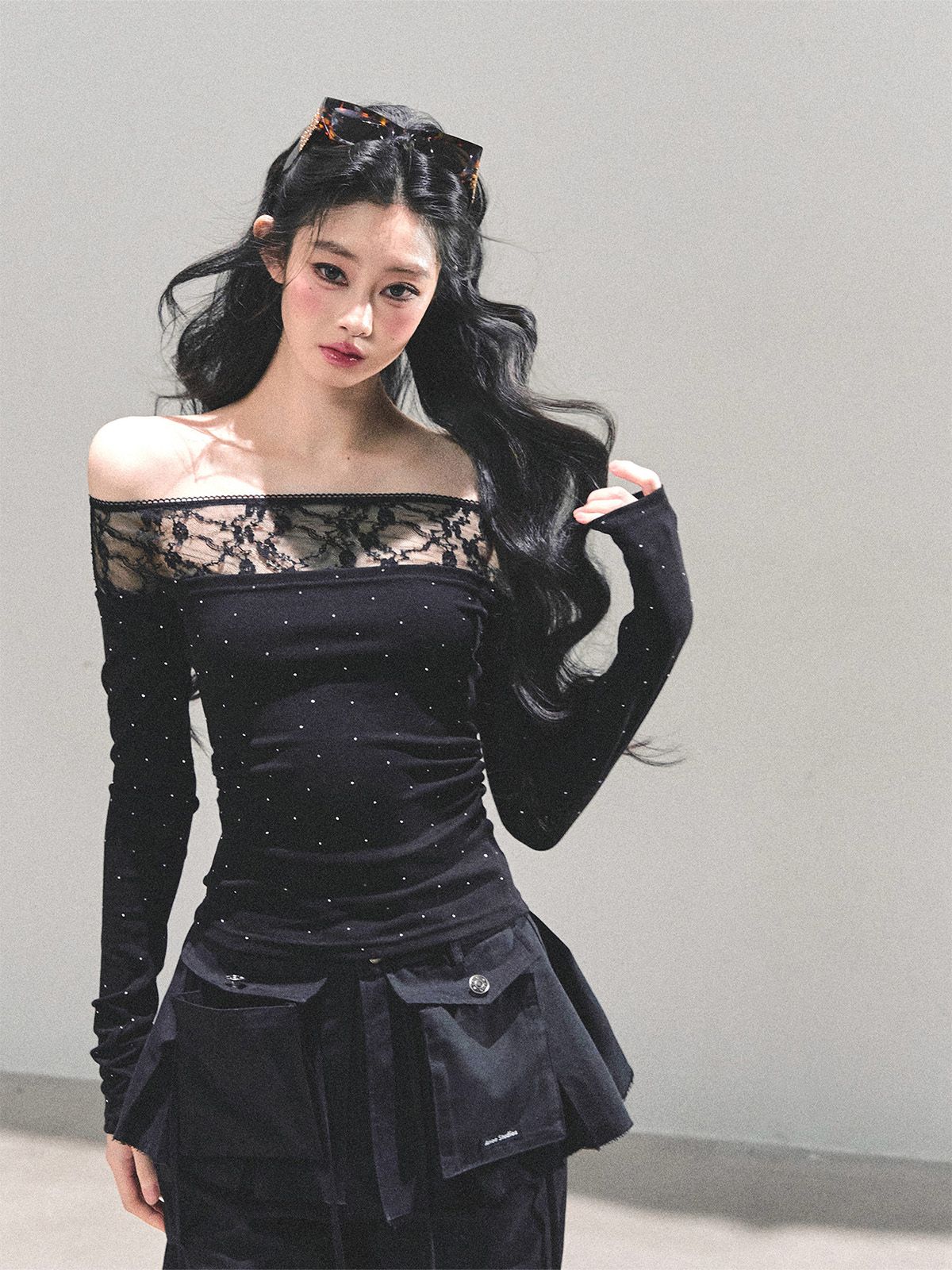 FA51663# 一字肩长袖蕾丝波点T恤女秋冬辣妹上衣 服裝批發女裝批發服飾貨源