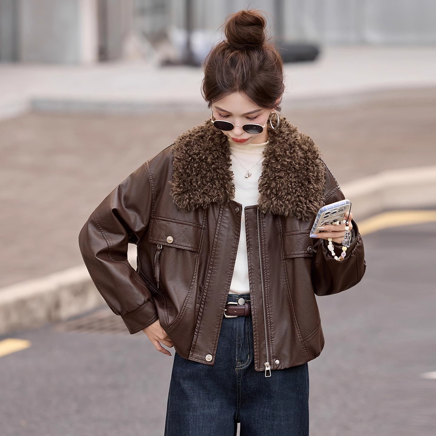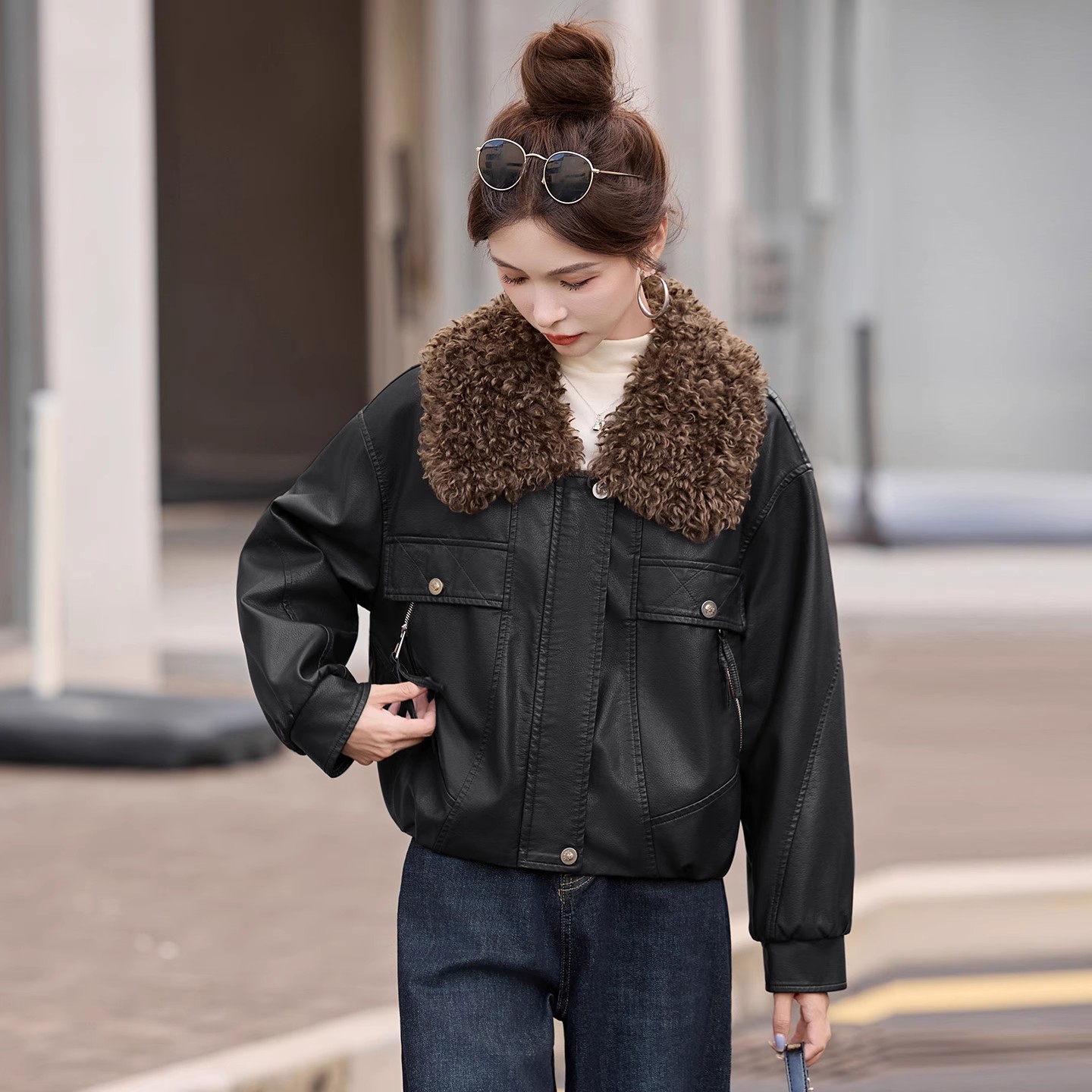 FA51680# 冬季新款可拆卸毛领皮衣外套女短款百搭显瘦洋气加绒加厚夹克 服裝批發女裝批發服飾貨源